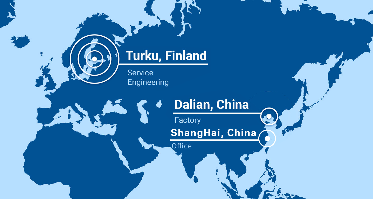 我們的工廠位于中國(guó)大連,上海銷售辦公室,同時(shí)在芬蘭圖爾庫設(shè)有工程和銷售辦事處。有了這些地方,我們可以為全球各地的客戶帶來便利的物流和服務(wù)選擇。
